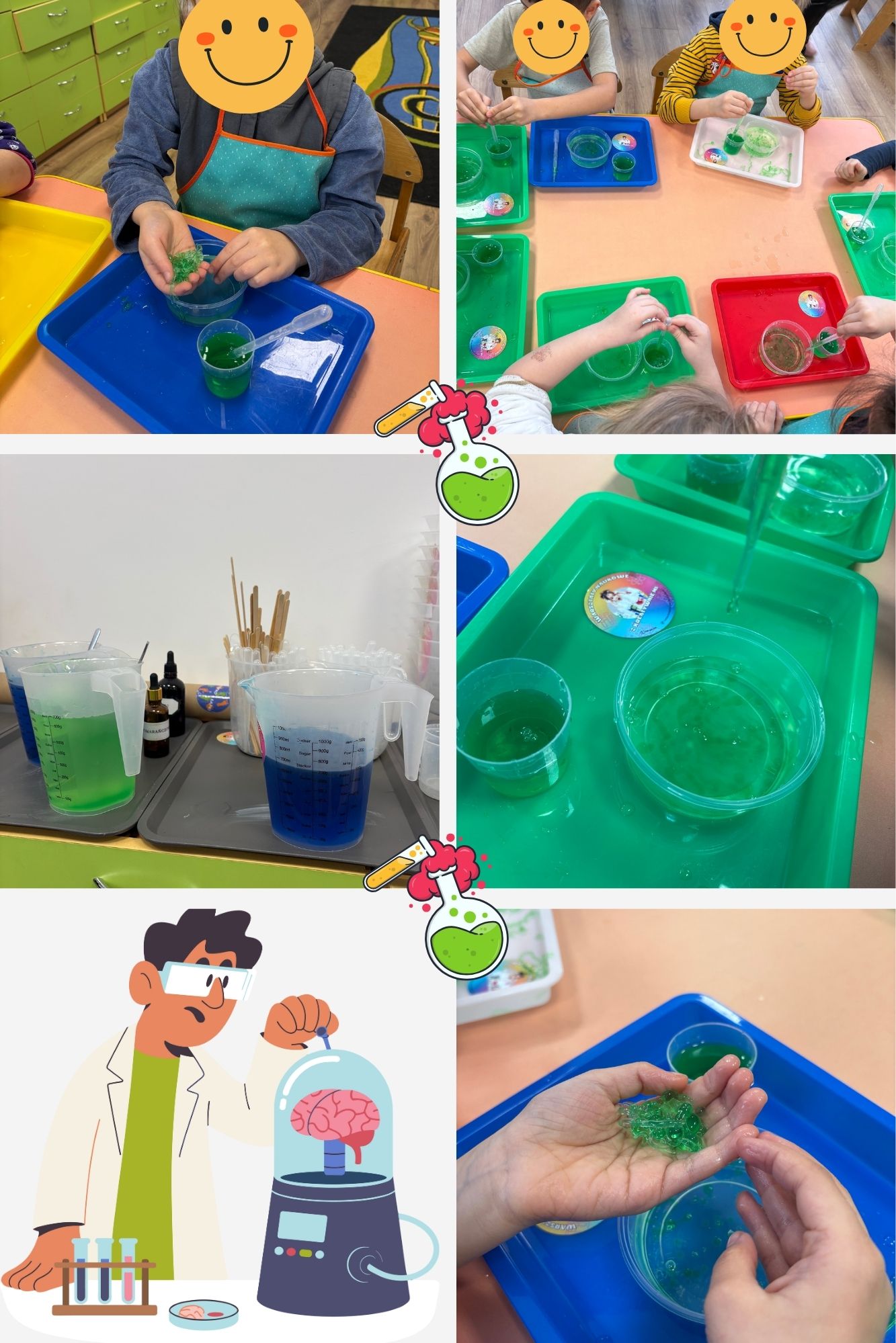 Krok po kroku, pod czujnym okiem prowadzących, dzieci poznawały fascynujący świat prostych reakcji chemicznych. Z ogromnym zaangażowaniem mieszały składniki, obserwowały zmiany i z zachwytem patrzyły, jak z płynnych substancji powstają niezwykłe, elastyczne i przyjemne w dotyku masy.
